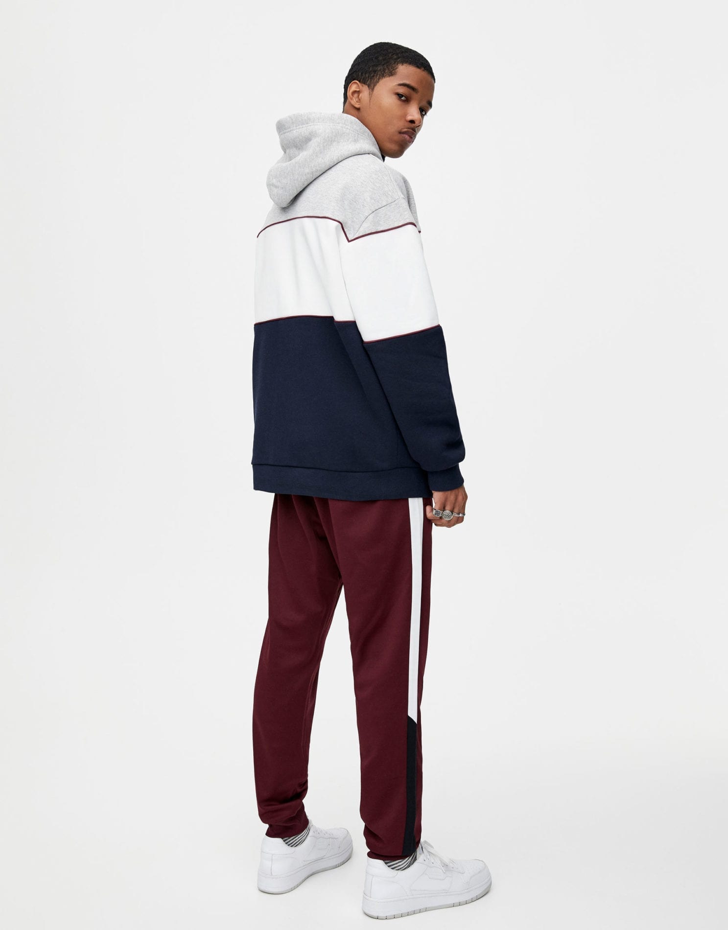 Hoodie with a burgundy, white and blue colour block design, a slogan and graphic printed on the chest, a grey drawstring hood and long sleeves.
